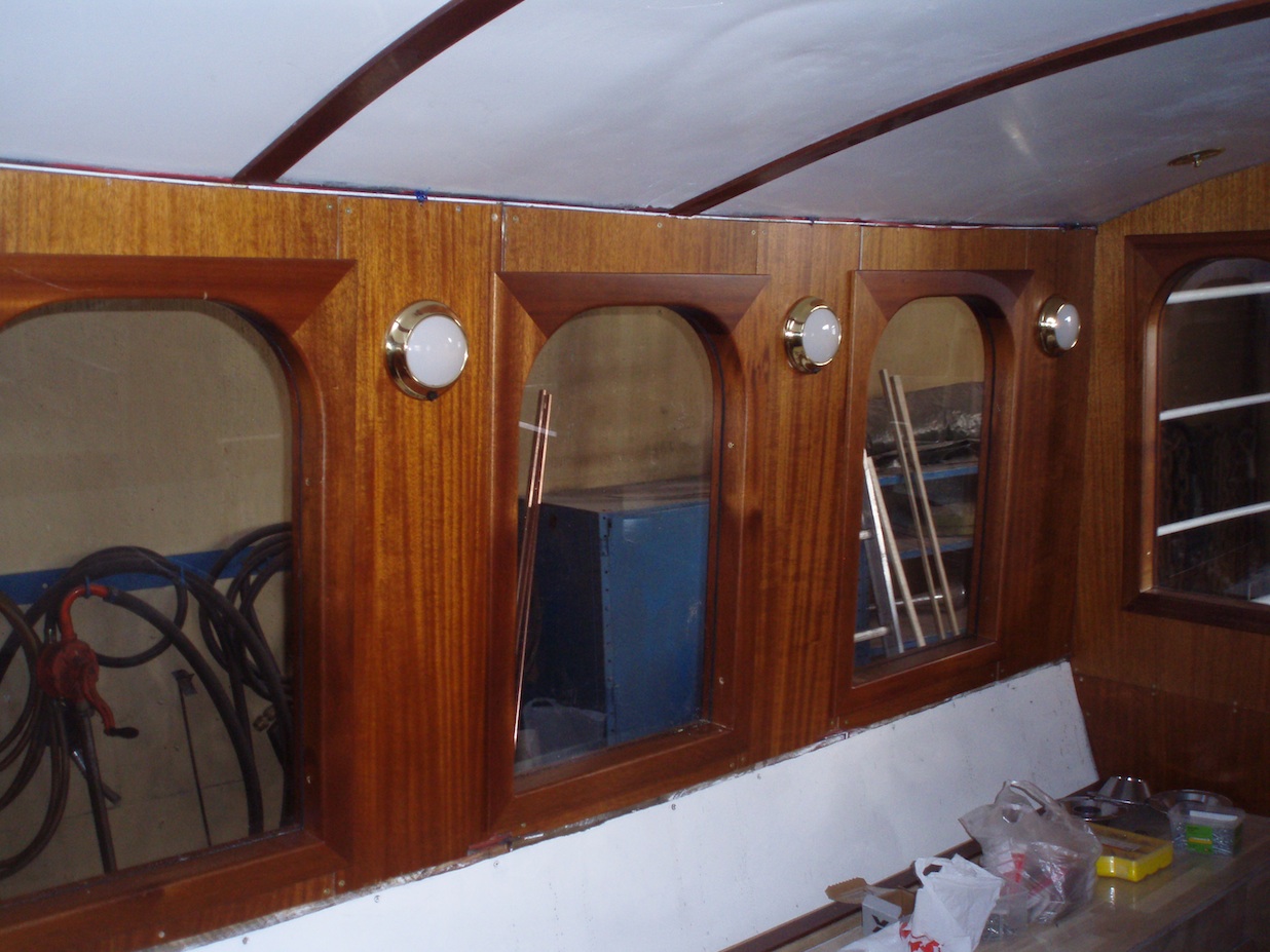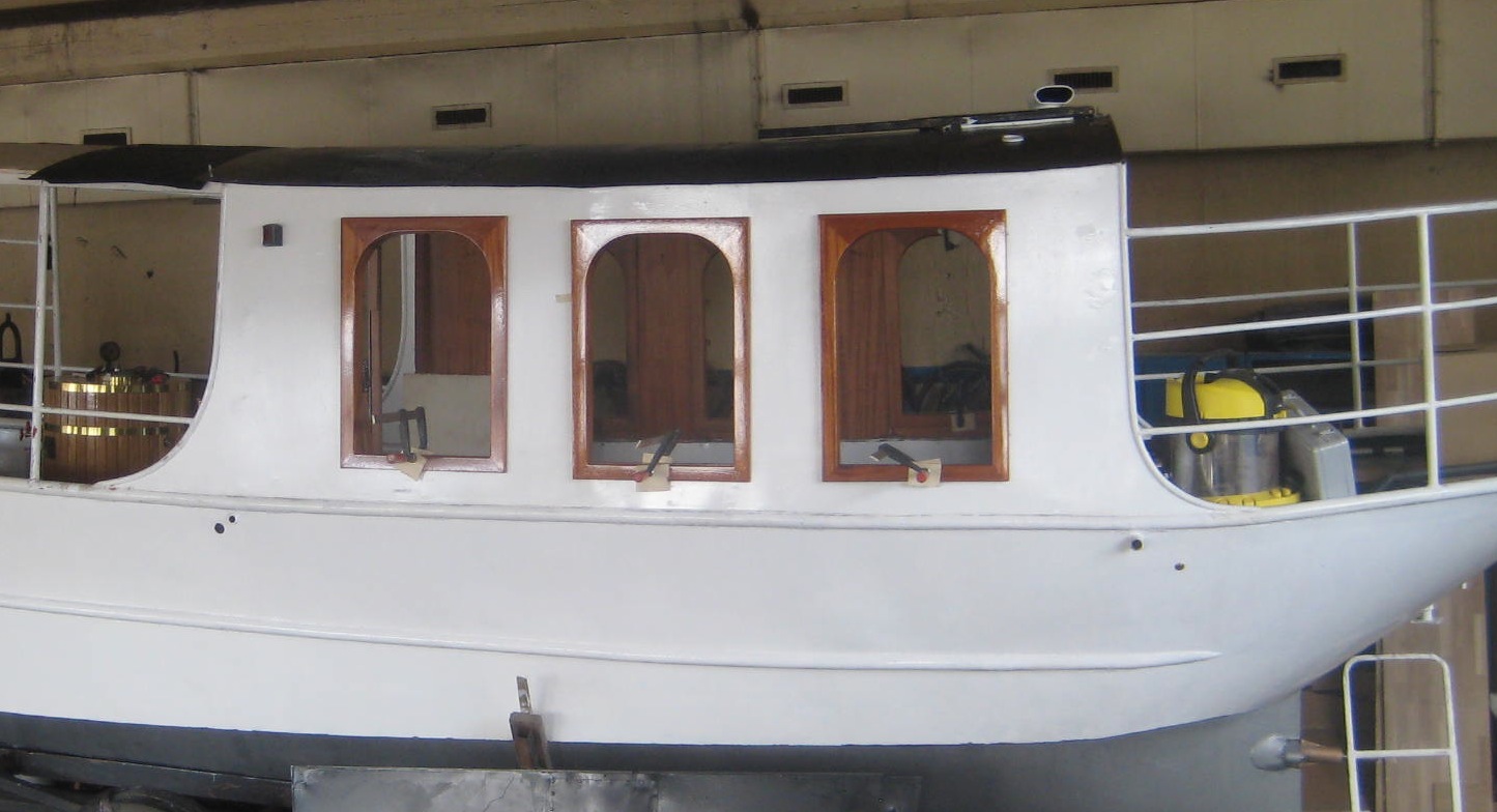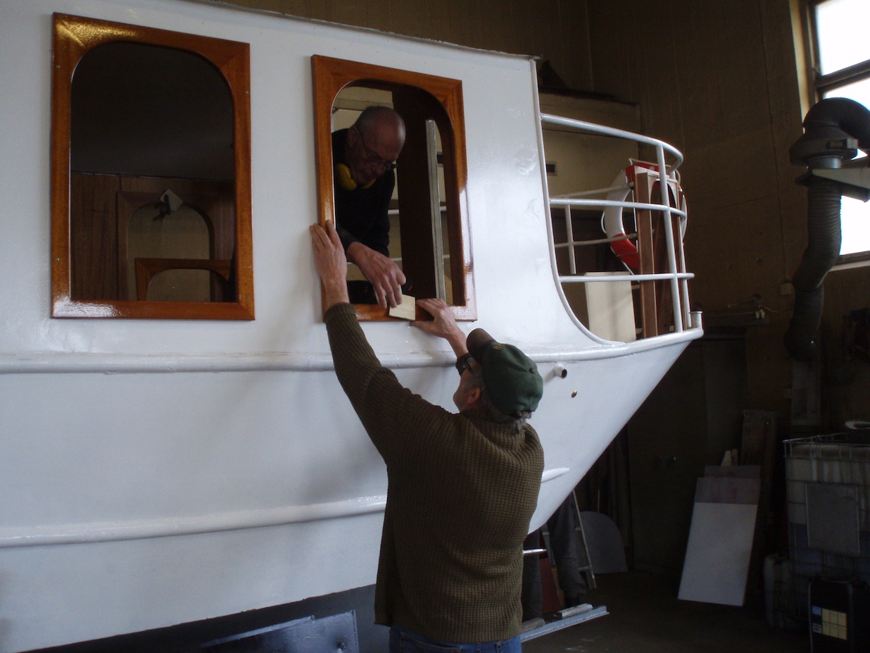 De nytillverkade och specialskräddade fönsterbågarna har legat klara invid båten ett tag men nu är det dags att få dem på plats. Vi valda att lacka dem med blank utsida och sidenmatt insida.